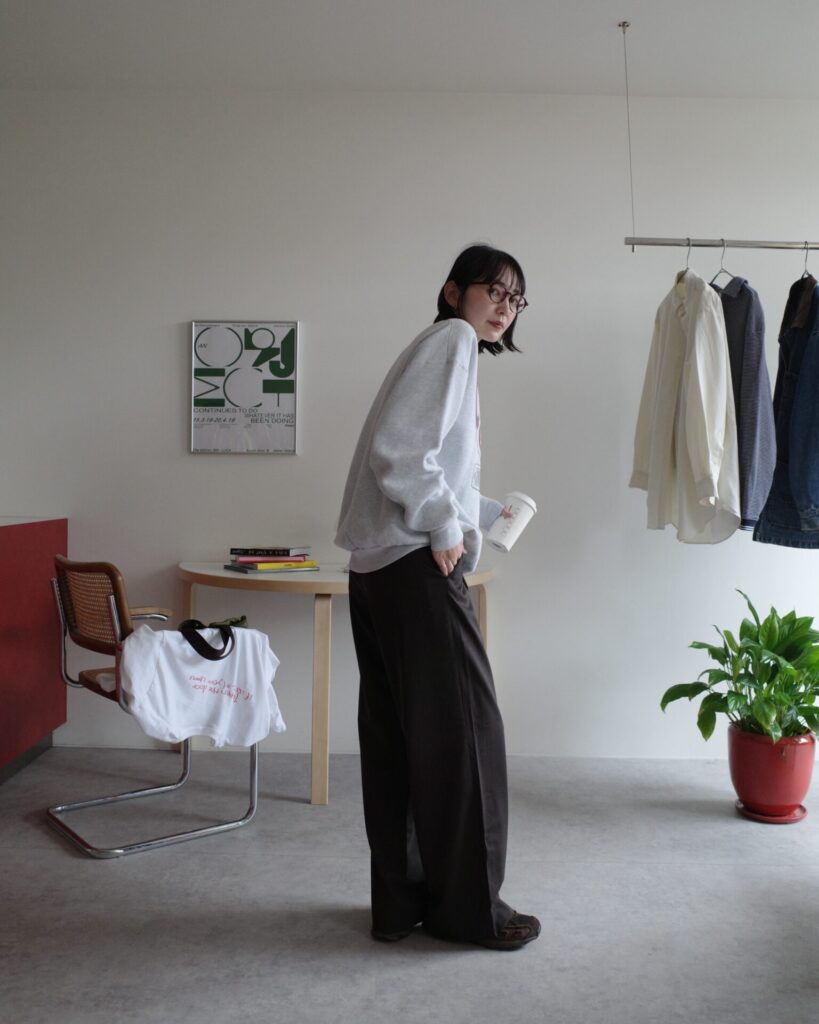 秋冬は、ニット、スウェット、ジャケット、コートと合わせて温かみのある落ち着いたスタイリングに。